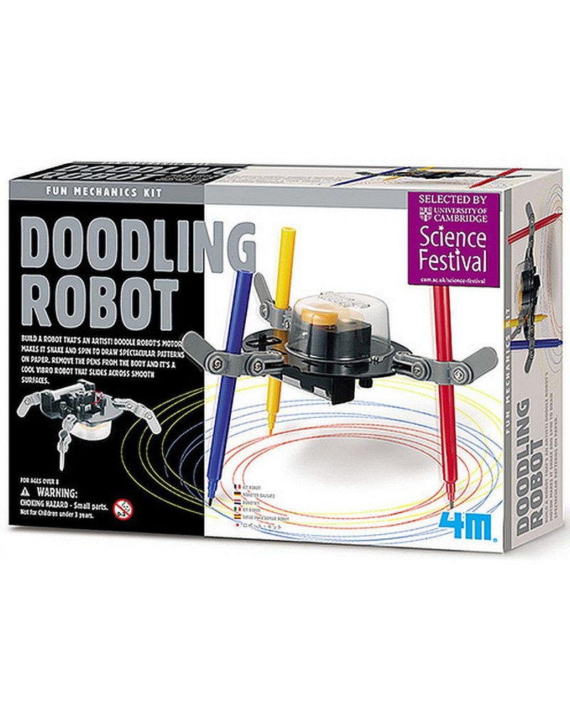 С творческия комплект, произведен от 4M, детето ви ще може да сглоби без чужда помощ механично роботче, което... може да рисува! Всичко, което трябва да бъде направено за целта, е в щипките на роботчето да бъдат поставени три флумастера, с които то да започне да изрисува кръгове. Ако пък флумастерите му бъдат махнати, играчката се превръща в обикновено роботче, което се плъзга по гладки повърхности.