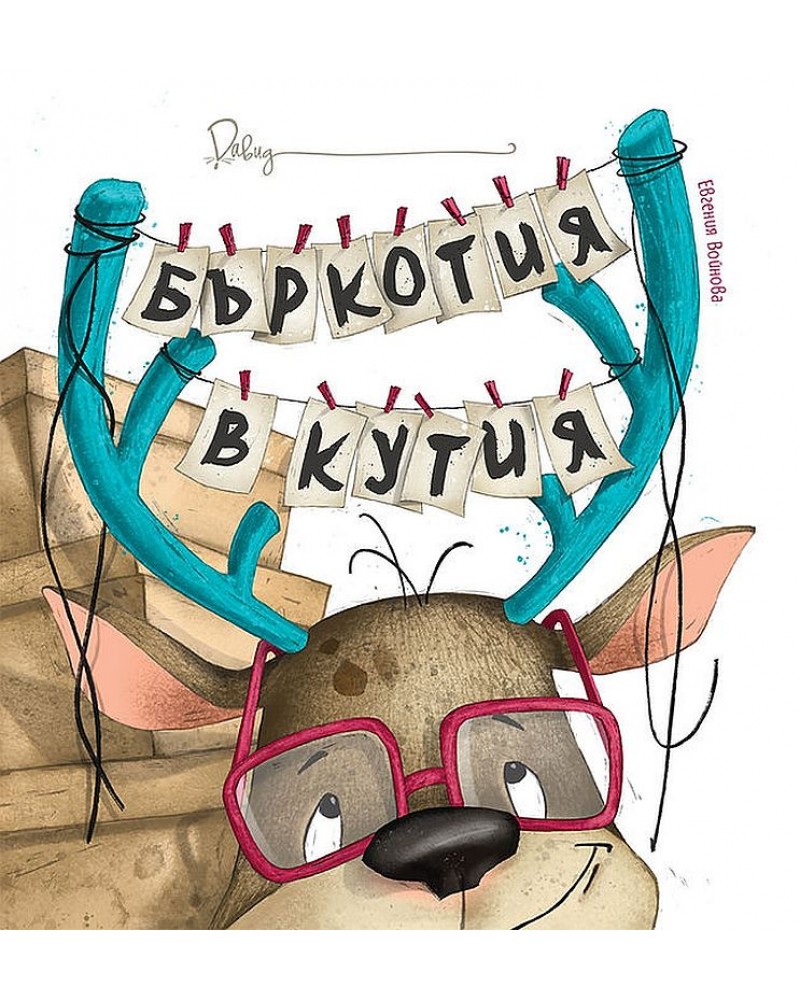 Може ли лошото време да промени трайно плановете ни за интересен ден? Може, разбира се, но само в случай, че ни липсва достатъчно фантазия... „Бъркотия в кутия“ е забавна история, която превръща един дъждовен ден в незабравим, весел и необикновен. Еленът никак не обича скучните дни, а току-що започналия нов ден се очертава да бъде точно такъв. Дъждът става повод, отчаяният елен да впрегне цялата си енергия и въображение, за да посрещне своите съседи на гости.