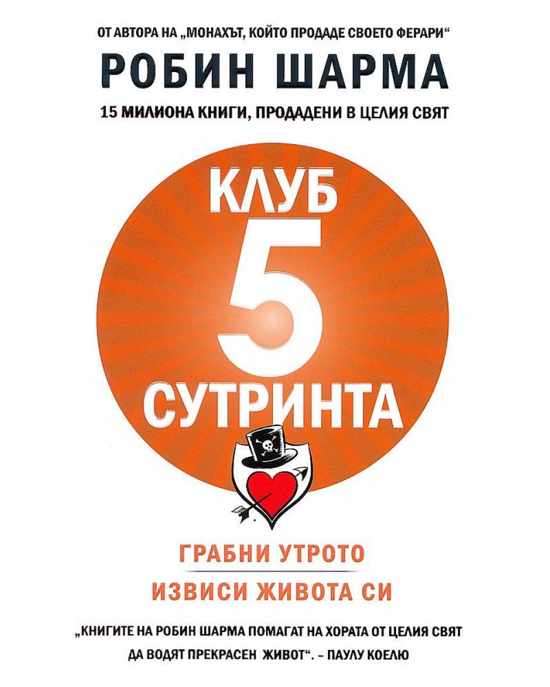 Легендарният експерт по лидерство и елитно представяне Робин Шарма въвежда идеята за Клуб „5 сутринта“ преди повече от двайсет години. Тя се основава на революционен утринен режим, който помага на клиентите му да увеличат максимално продуктивността си, да постигнат най-добро здраве и да бронират спокойствието си в една епоха на смазваща сложност. В тази книга, писана от автора в продължение на четири години, ще откриете навика на ранното ставане, който помага на толкова много хора да постигнат епични резултати, като издигнат на по-високо ниво щастието и жизнеността си. Чрез вълшебната – и често забавна – история на двама непознати и срещата им с ексцентричен милиардер, който се превръща в техен ментор, от „Клуб „5 сутринта“ ще научите: