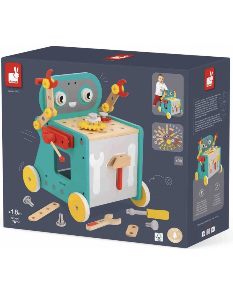 Игралният комплект Janod ще предложи множество възможности за забавление. Дървената работилница ще позволи на децата да имитират възрастните и да развиват различни умения. Мъниците ще се научат и колко е важно да се внимава с инструментите докато стимулират фините си моторни умения и сръчност.