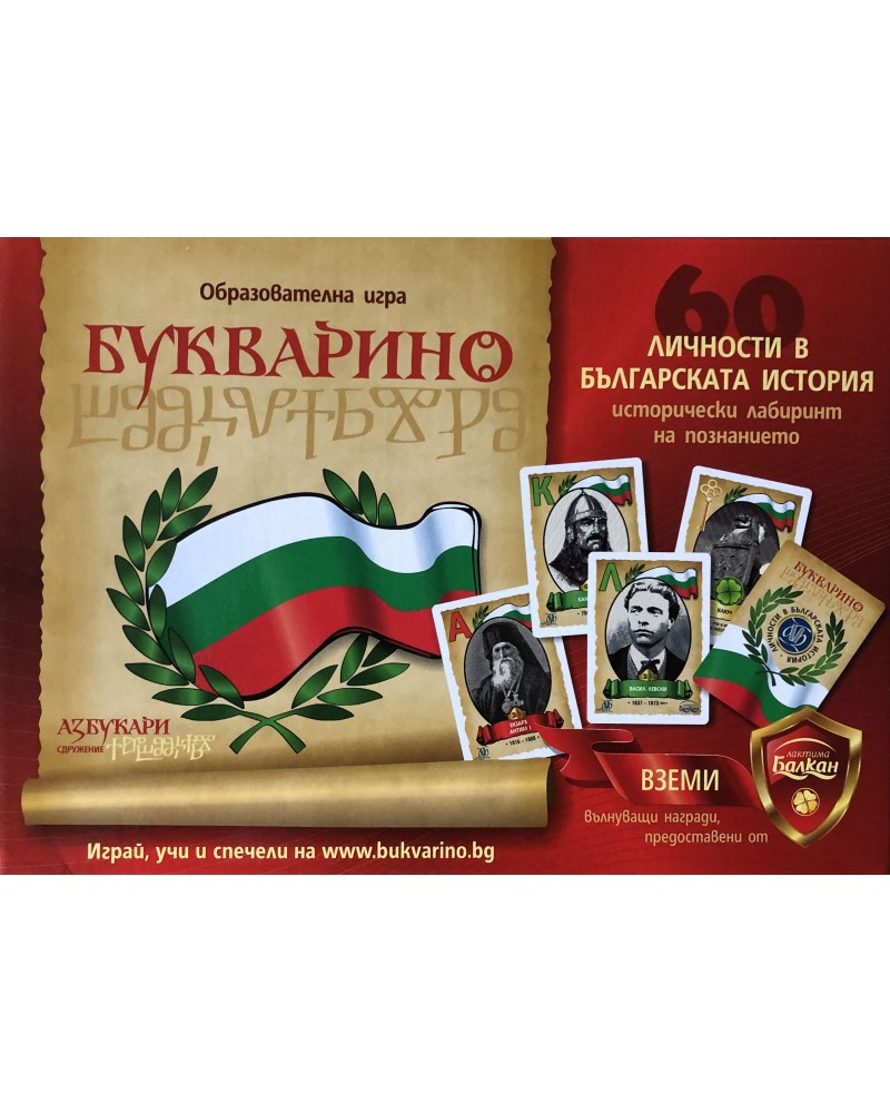 „Букварино“ се състои от 60 карти за игра. На тях се съдържат бележити личности от българската история, които са описани подробно със свои характерни и значими дела според периода на своя житейски път. „Букварино“ е разделено на три стратегически нива, които карат участниците – децата и възрастните, да се състезават в група от четирима души, за да спечелят максимален брой точки, като показват безупречни знания по правопис, правоговор, история и математика.