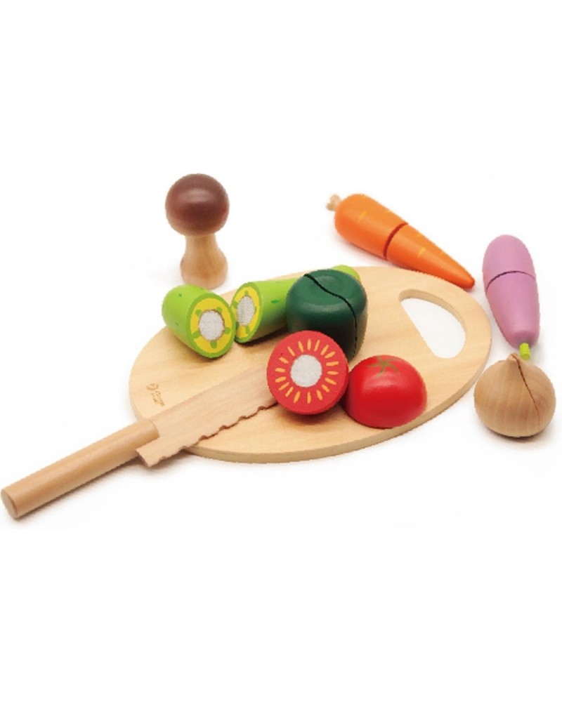 Преди рязането винаги е било сред домакинските дейности, които родителите дълго не позволяват на децата да правят сами. Да, но не и сега, защото от Classic World са направили детски комплект от дърво, с който децата не само ще учат различните зеленчуци, ще се учат да помагат, а всичко това ще става безопасно. Ножът в сета е от дърво и е напълно безопасен, а зеленчуците се режат само на ужким. Те са предварително разполовени, като частите им са съединени с велкро лепенка. С ножа децата само ги разполовяват. В комплекта има морковче, гъбка, тиквичка, чушка, домат, лук и патладжан, както и дъска за рязане.