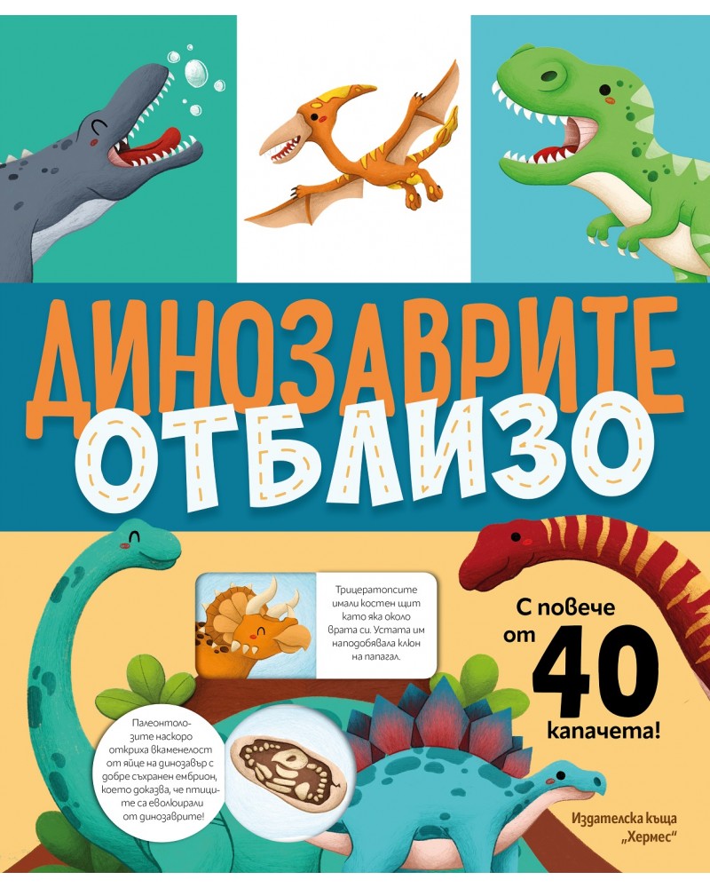 Книжката „Динозаврите отблизо“ съдържа удивителни факти, любопитна информация, цветни илюстрации и капачета, които ще ти разкрият неподозирани тайни! Как се казва най-големият динозавър? Знаеш ли, че Тиранозавър Рекс е бил с размерите на автобус? Защо динозаврите са изчезнали от лицето на Земята? Това са само част от въпросите, чиито отговори ще откриеш на тези страници. Впусни се в това приключение и виж света на динозаврите отблизо!