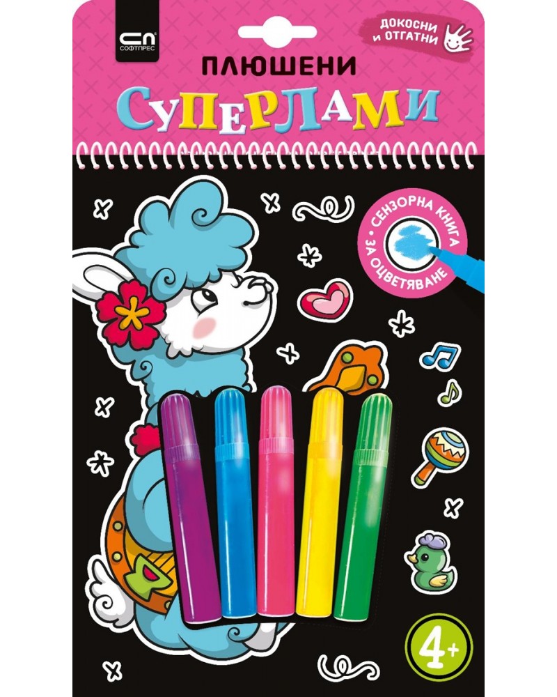 „Плюшени суперлами“ е сензорна книга за оцветяване с включени флумастери! Фонът е покрит с черен велур, който осигурява сетивно преживяване и ограничава излизането от линия. А веселите римувани гатанки правят оцветяването още по-забавно.
