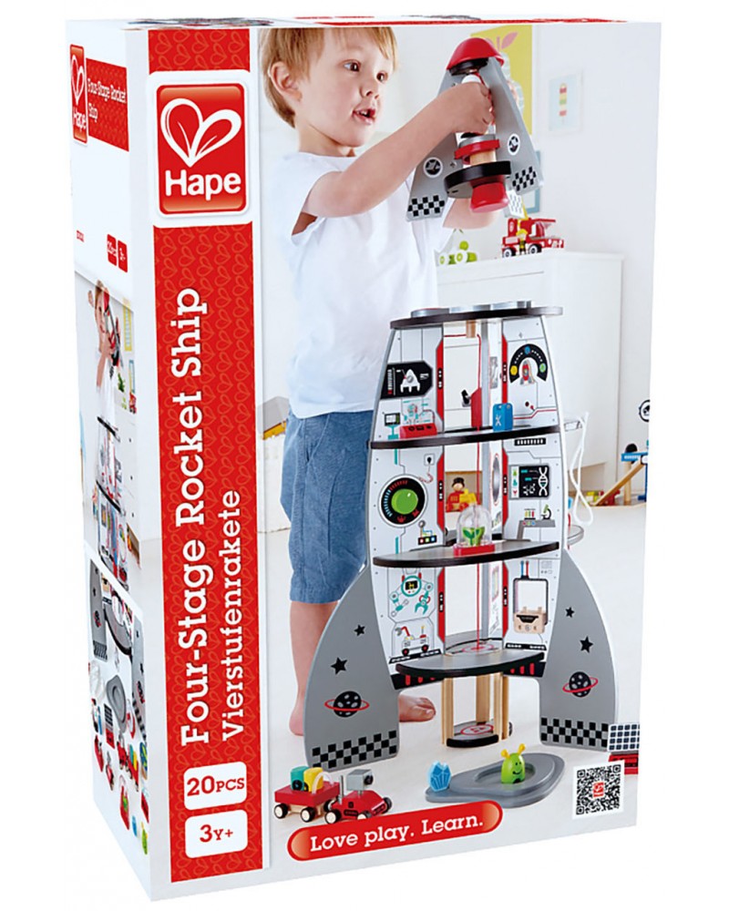 Ракетата е изработена от дърво и има 4 етажа, на които детето да разиграва различни сцени. Множеството малки допълнителни елементи ще му помогнат да създава различни истории с всяка игра. А за да е още по-забавно можете да се включите и вие и заедно да обиколите необятния космос.