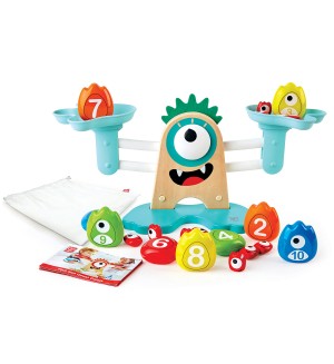 Весело семейство чудати чудовища се е настанили върху дървената везната на Hape. Ще успее ли вашия малчуган да постави еднаква тежест в едната и другата ръка на голямото чудовище?
