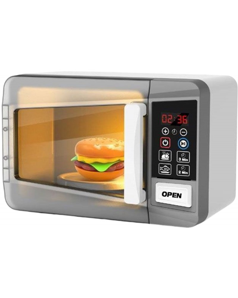 В комплекта са включени чиния, щипки и разнообразна храна – бургер, пиле и риба, с които децата могат да приготвят въображаеми ястия. Микровълновата разполага с бутон за отваряне на вратата, а при включване свети с ярки светлини, имитирайки процеса на готвене.