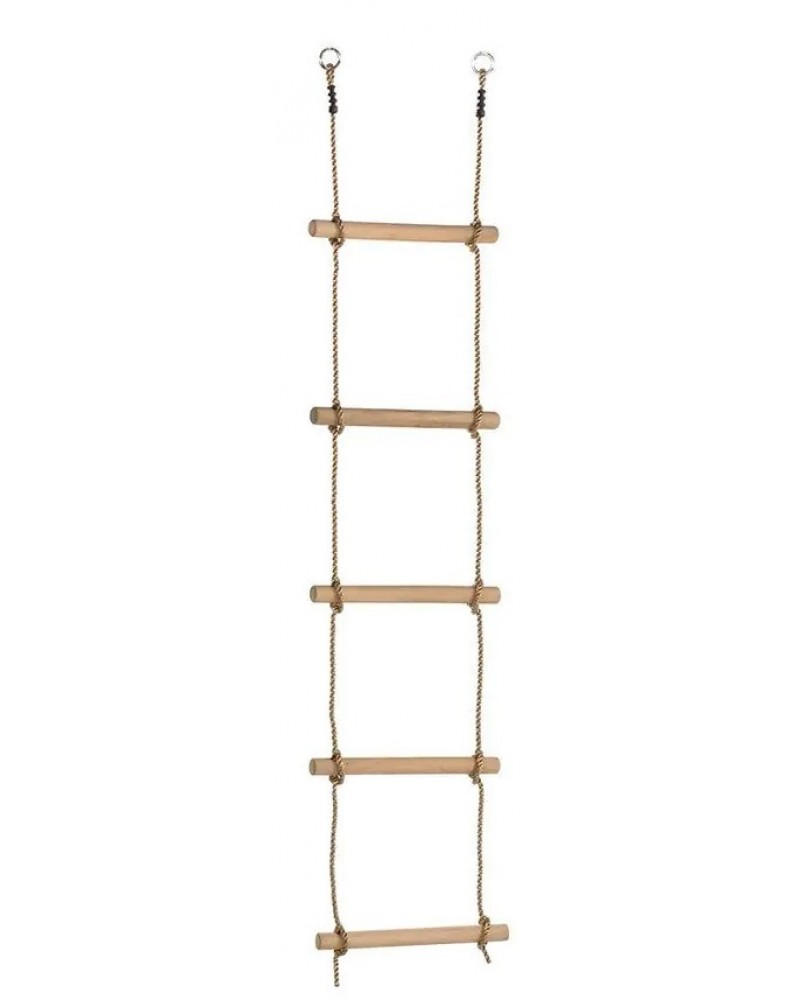 Направете двора си перфектното място за игра заедно с въжената стълба от КВТ. Тя ще спомогне за развитието на координацията и баланса на децата. Стълбата е с 5 дървени стъпала с размер 3.5 х 4 cm, a общата ѝ дължина е 1.5 m. Въжето е изработено от поликонп, меко и приятно е на допир. Всяко стъпало е закрепено със специален двоен възел, който предотвратява завъртането, а пръстените за закрепяне - от поцинкована стомана.
