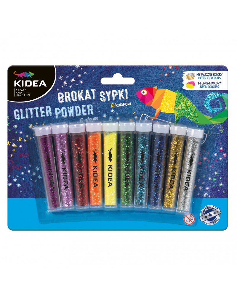 Комплект от 10 цвята сух брокат от Kidea в отделни контейнерчета.