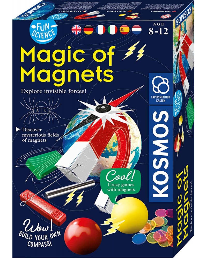 Как можете да си направите компас, къде са магнитните полюси, как действа магнитна сила и какви ефекти поражда. Тези и още много други интересни факти ще можете да научи всяко дете като само направи няколко много готини и напълно безопасни експеримента със страхотния научен комплект Магията на магнитите на марката Kosmos.
