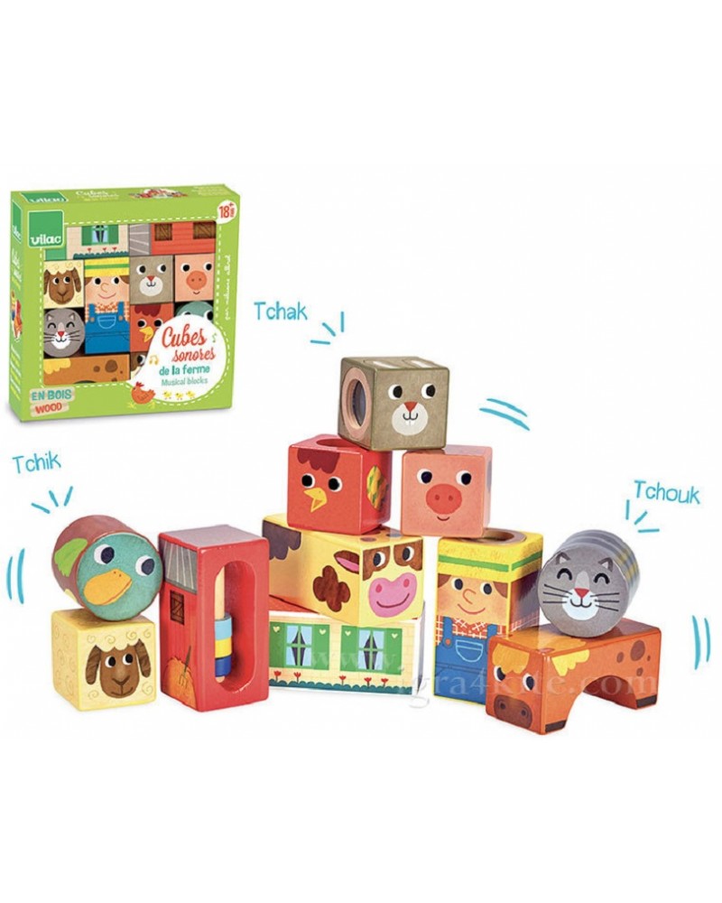 Детски музикални кубчета – Ферма на френската фирма Vilac. Подходящи за деца над 3 годишна възраст. Комплекта съдържа 11 многоцветни дървени кубчета на фермерска тематика. Кубчетата са боядисани с бои на водна основа и са напълно безвредни.