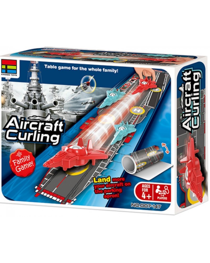 Kingso представят една много интересна и забавна игра, с която цялото семейство много ще се забавлява. Самолетният кърлинг може да се играе с между 1 и 4 играча. В комплекта има дълго платно, което е с дизайн на самолетна писта и един самолет. Играчите се редуват да пускат самолета по пистата, като той трябва да спре на мястото, отредено за кацане. Пистата разполага с места, на които има разграфение за различни точки. От играчите зависи след колко опита, ще смятат че играта приключва, сумирайки точките на всеки един.