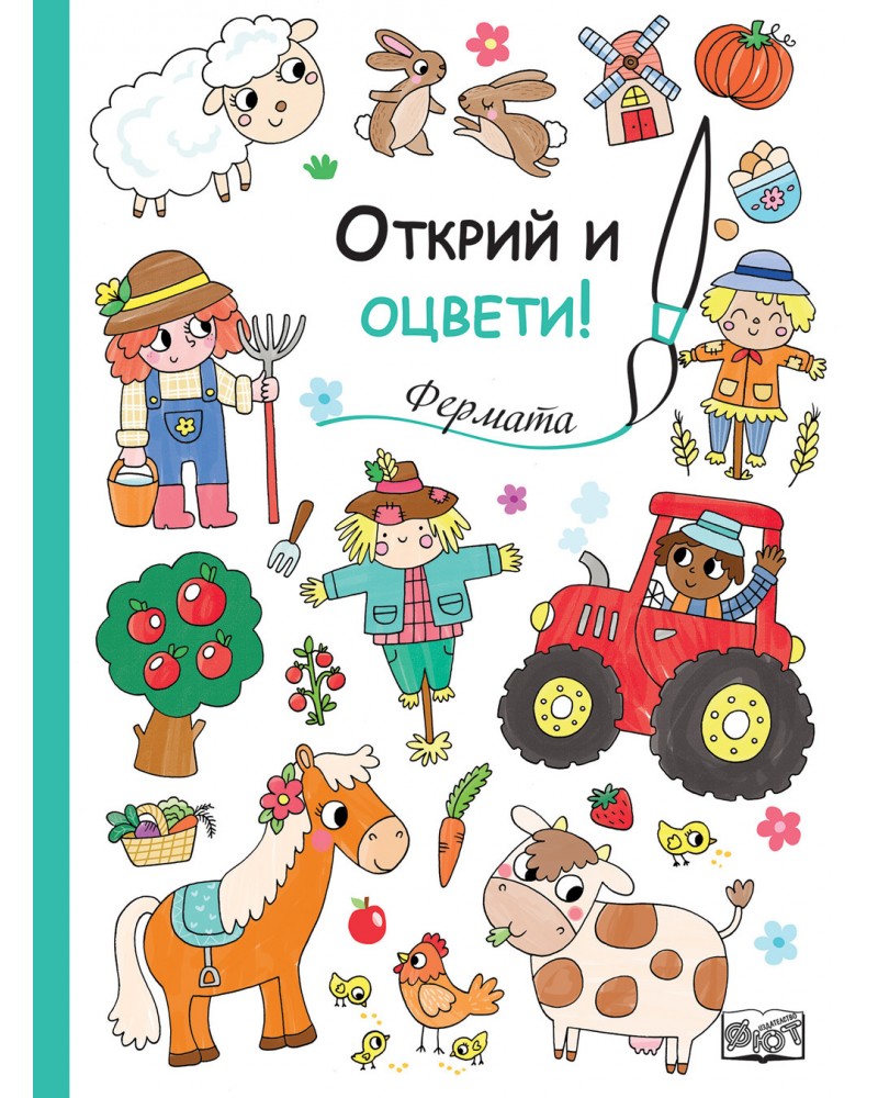 В книгата „Открий и оцвети!: Фермата“ ще се запознаете със зеленчуци с личица, с гъски с шапки, танцуваща крава и пеещ петел, спящи кучета! Ще откриете и още много смешни картинки и забавни герои от фермата!