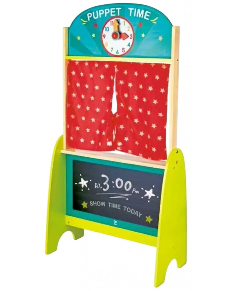 Тази дървена сцена за куклен театър от Hape е перфектният подарък за всяко дете, което обича да създава свои истории и спектакли. С красиви завеси, които могат да се отварят и затварят, сцената създава усещане за истинско театрално представление. Включен е и малък часовник, който добавя интерактивност и учи децата на времето. Черната дъска за писане с тебешир дава възможност за допълнителни забавления – децата могат да пишат заглавия на представления или да рисуват декори. Компактна и лесна за съхранение, тази играчка е чудесен начин да развивате въображението на малките актьори!