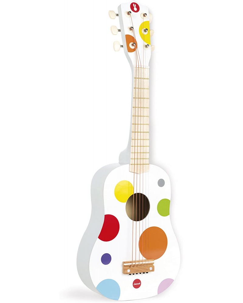 Китарата от Janod ще се хареса на всички малки любители на музиката. Концертите и изпълненията са гарантирани с тази дървена музикална играчка. Тя е с весели многоцветни точки и разполага с 6 струни, които ще помогнат на децата да открият различните звуци и да развият чувството си за ритъм.