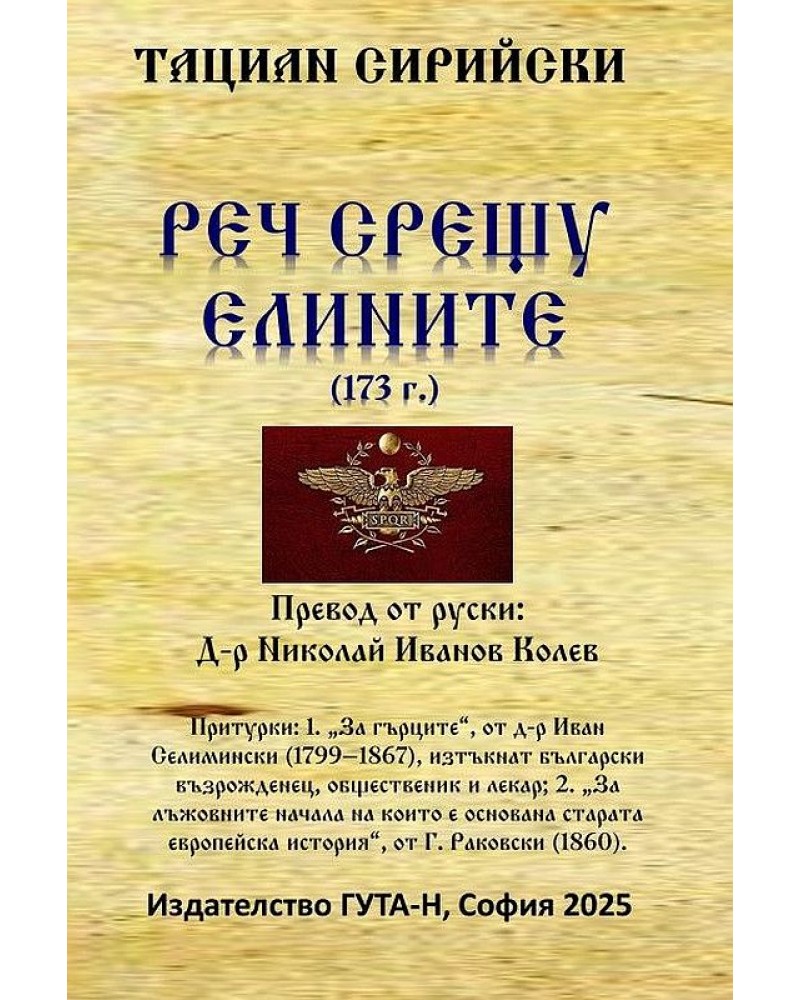 в ръцете си държиш едно ранно философско произведение обосноваващо християнството като противовес на езичеството, чрез убийствена критика на езичеството. За живота на Тациан знаем съвсем малко. Той е живял във втори век. Бил ученик на мъченика Юстин. След смъртта му той се е оттеглил в Сирия. Счита се, че е един от основателите на секта на енкратитите, които са се отказвали от брака, наричайки го блудство, от месото и виното и са водили изключително аскетичен начин на живот. Официална християнско догма счита схващанията на Тациан за християнството за ерес. Това най-добре е изразено от Ириней Лионски в книгата „Против ересите“: „…Първият, който въведе тази хула, беше Тациан, който, като ученик на Юстин, докато беше с него, не изразяваше нищо подобно, но след неговото мъченичество се отклони от Църквата и, подтикнат от мисълта да бъде учител, като най-превъзходен пред другите, състави свой собствен образ на учението.“
