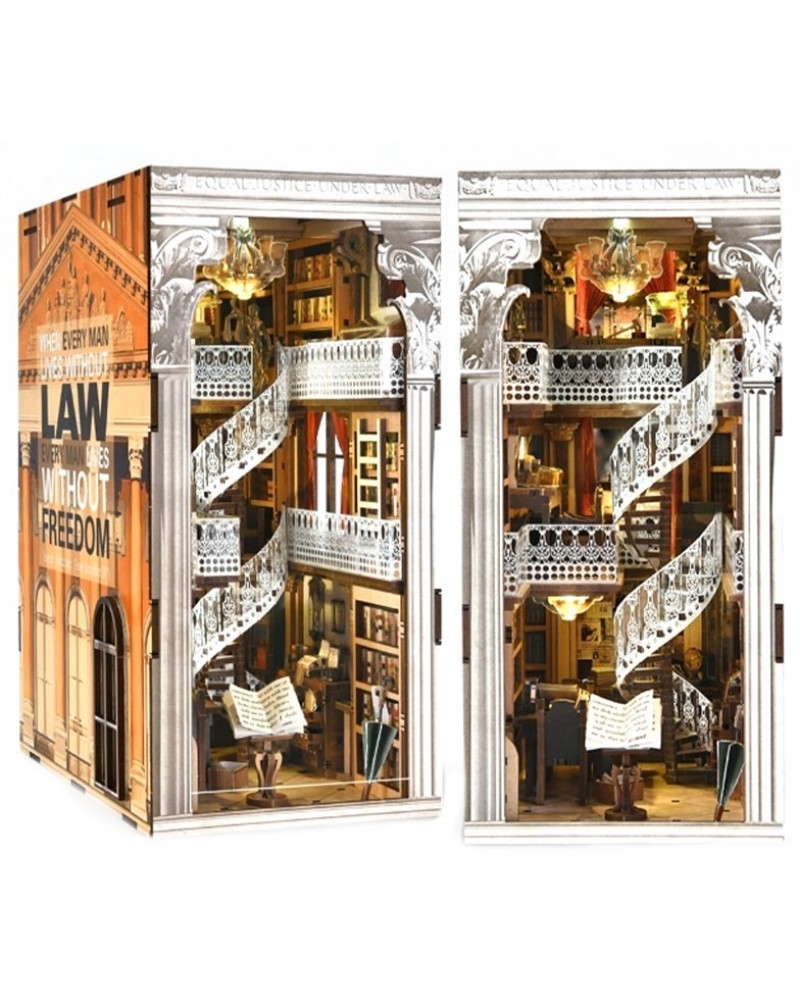 Minicity Law Library представя този страхотен сглобяем модел, който пресъздава миниатюрен книжен кът, вдъхновен от интериора на Юридическата библиотека на Капитолия в щата Айова. Този проект съчетава естетика и символика, като отдава почит на знанието и стойността на закона, представени чрез ръчно изработен мини свят, който може да се постави директно между книгите на домашната библиотека.