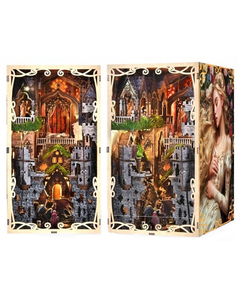 Minicity Sleeping Beauty е комплект за създаване на вълшебно кътче за книги, вдъхновено от класическата приказка за Спящата красавица. Миниатюрната сцена съчетава романтична архитектура, загадъчна гора и приказна атмосфера, които превръщат книжния рафт в истинско произведение на изкуството. Комплектът е предназначен за сглобяване от самия потребител, като предоставя не само удоволствие от творческия процес, но и дълбоко чувство на удовлетворение след завършването му.