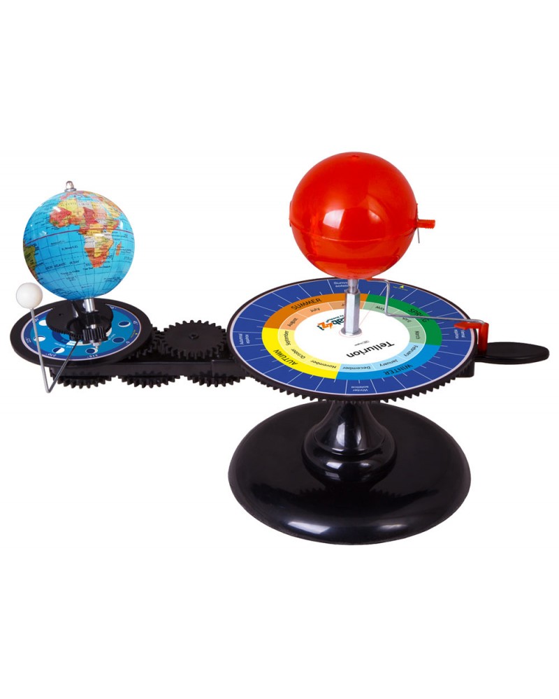 Земният глобус се върти около Слънцето обратно на часовниковата стрелка. Можете да наблюдавате смяната на сезоните с помощта на телурия. Докато Земята обикаля около Слънцето веднъж, Луната обикаля около Земята 12 пъти, което съответства на 12-те месеца от годината.