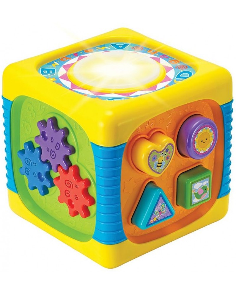 Бебешки активен куб от WinFun, подходящ за деца над 8 месеца. Кубът произвежда различни звукови ефекти, а едната му страна свети – за целта играчката трябва да бъде захранена с 3 батерии АА, които са включени в комплекта с демонстрационна цел.